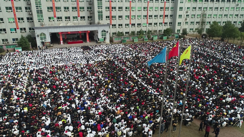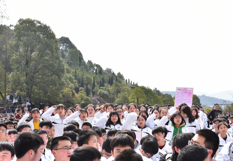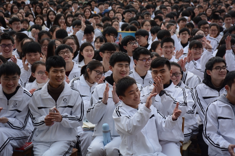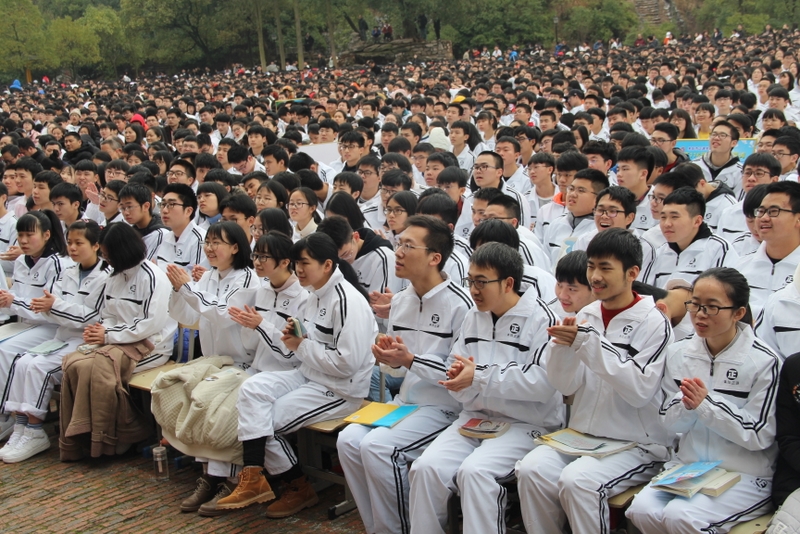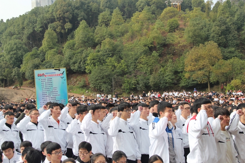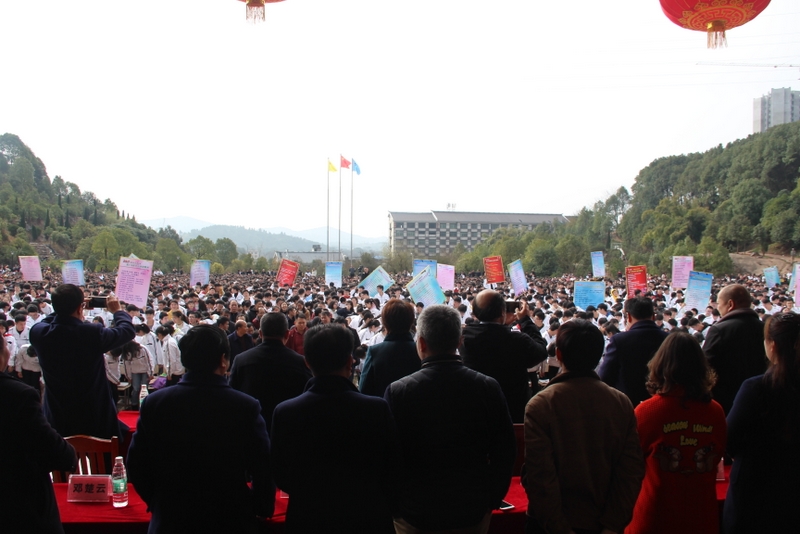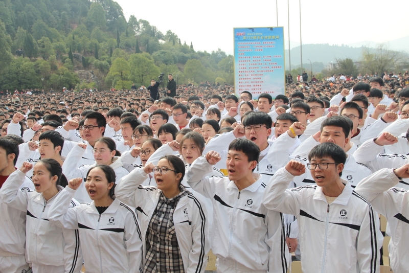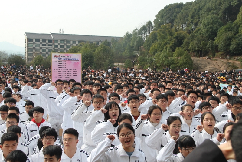 最后,全体高三学生起立,全场近两万名师生员工在大会主持人带领下,一起为高三学子呐喊助威: