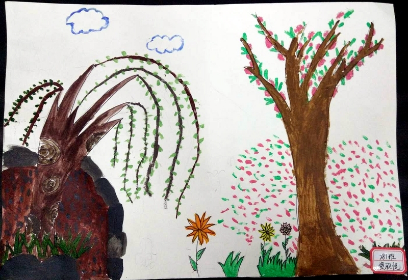 假山旁有几棵柳树,它们像一个个披着长发的姑娘,神清气爽地站在那儿。这时,一阵微风吹来,柳树立刻翩翩起舞,柳叶也随风摇摆。正源的孩子都喜欢在这玩儿,你看,他们又追又闹,玩得多开心啊!