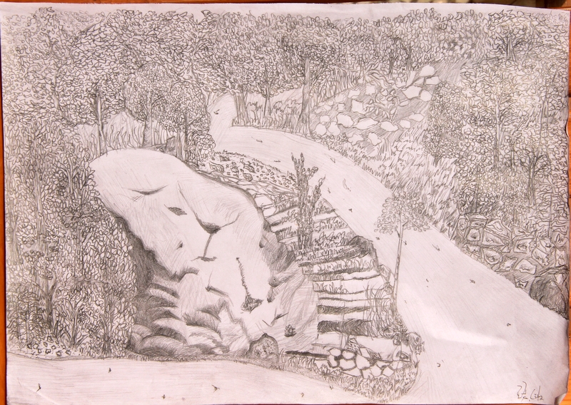 坡下,举目皆是褪装的枯叶铺成的地毯,景观旖旎。古诗有云:“繁华尽头有悲凉,尘埃深处是繁花。”所以我扶着两旁的树慢慢下来,有些惊悚,生怕摔成“狗啃泥”。但显然是我多虑了,竟不想枯叶下的不是黄土,而是一层一层的台阶,这简直是天阶,真是太令人兴奋,激动了。