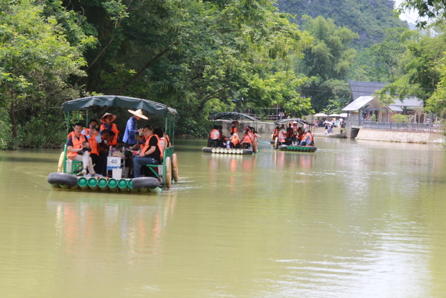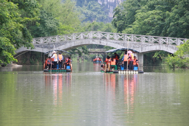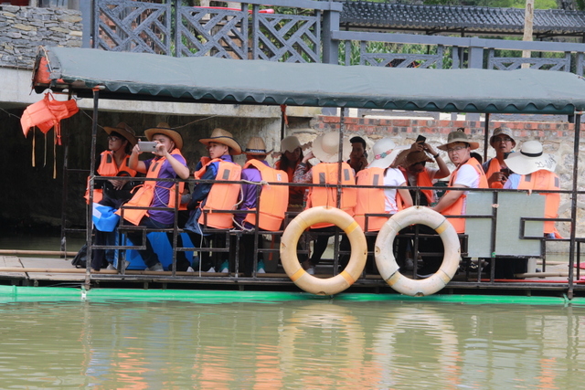 中午时分,williamhill威廉希尔亚洲官网教师2019广西之旅团队抵达名仕田园,这里青山绿水,相互辉映,形成许多秀丽景点,而最为人称道的,莫过于明仕河。这里翠竹绕岸,农舍点缀,独木桥横,稻穗摇曳,农夫荷锄,牧童戏水,风光俊朗清逸,极富南国田园气息。在这里,williamhill威廉希尔亚洲官网的教师们乘坐竹排,顺流而下,饱览两岸迷人景色。听壮歌、学壮语、赏壮美河山,williamhill威廉希尔亚洲官网教师们乘坐的10艘竹排穿行在“长留仙境”之中,也留下了williamhill威廉希尔亚洲官网的青春与激情。