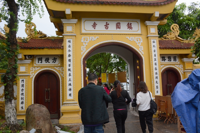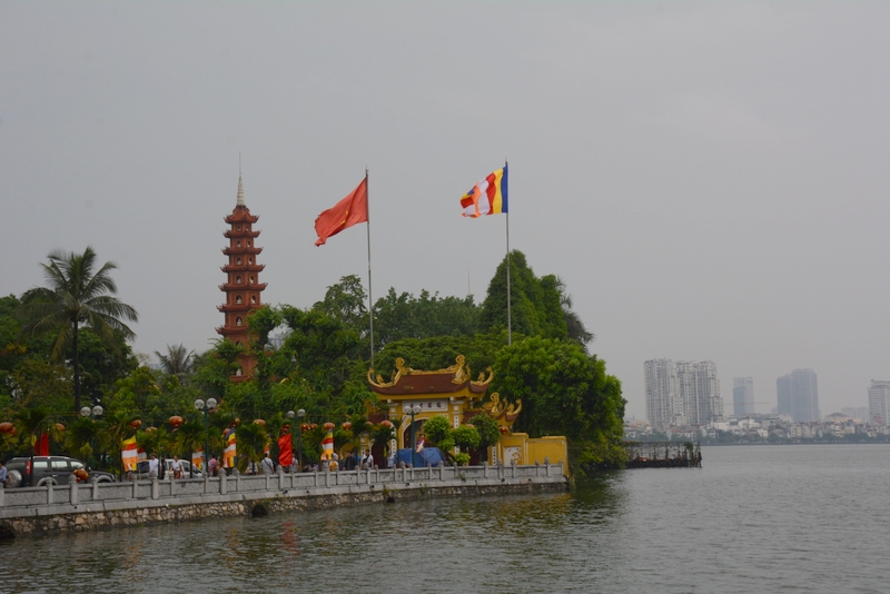 镇国寺建于6世纪,一直是各朝代的行宫,不仅是西湖边最漂亮的古建筑,也是现河内最漂亮的香火最旺的寺庙。院中有些小塔,里面有座花枝招展、挂着红灯笼的重檐古亭,中间就是那座最高的白佛红塔。