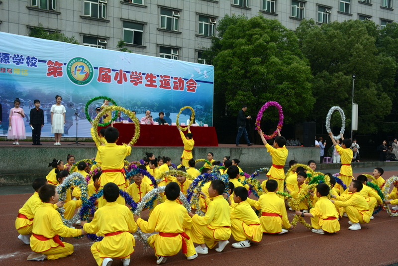 五年级226班同学组成花环队。他们手举花环,五彩缤纷,朝气蓬勃,昂扬向上。在主席台前,他们暂停下来,面向学校领导,摆出五环造型,高喊口号“正源正源,勇往直前;敢打敢拼,敢为人先!”这是青春的音符,恣意地在竞技场上跳动;这是青春的画笔,潇洒地画出胜利的徽章。