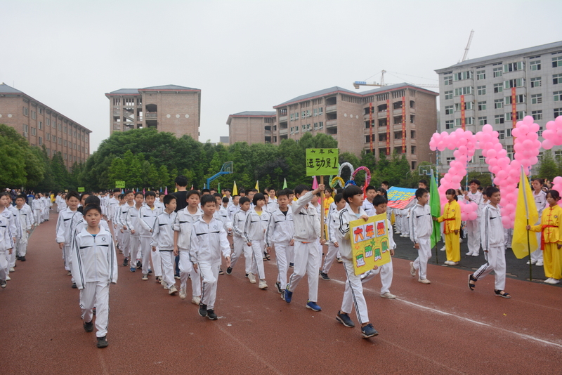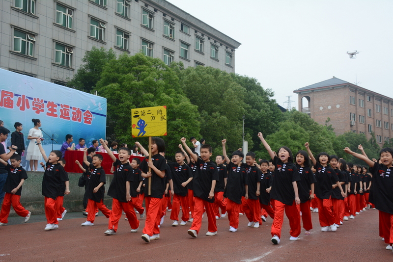 各年级每三个班组成一个方阵,身着不同的统一着装,举着彩绘各异的队牌,高呼各具特色的口号,英姿飒爽,气贯长虹。