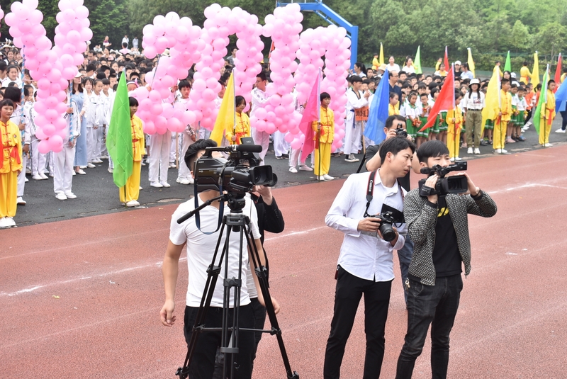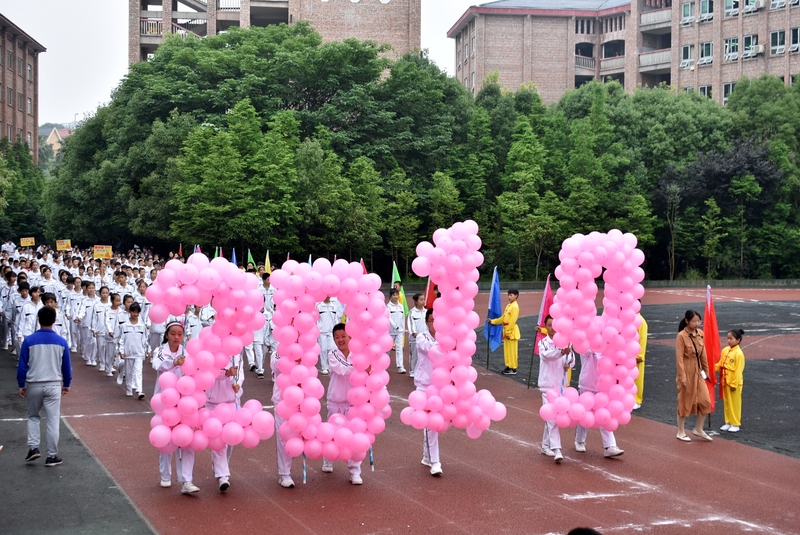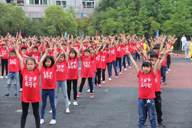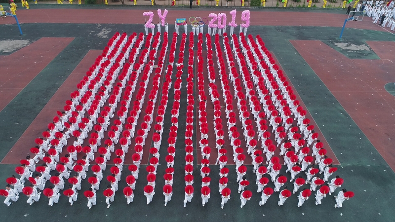 通学部方阵“ZY 2019”的粉红色气球造型特别醒目;四年级深红短袖上装上“全正源 最可爱”最能吸引眼球;三年级的方阵分别命名为花之队、蝶之队、梦之队,同学手腕上的各色花环熠熠生辉;一年级的队牌上画着长着翅膀的天使,别看他们个头小,可是从着装上看,个个都是“功夫小子”;最后出场的是幼儿园的小朋友,他们手中的道具简直是异想天开,几乎不需要花一分钱,居然是纯净水瓶内面装上砂子,外面用红纸隐藏起庐山真面目,小豆豆们摇动起来银铃般作响……