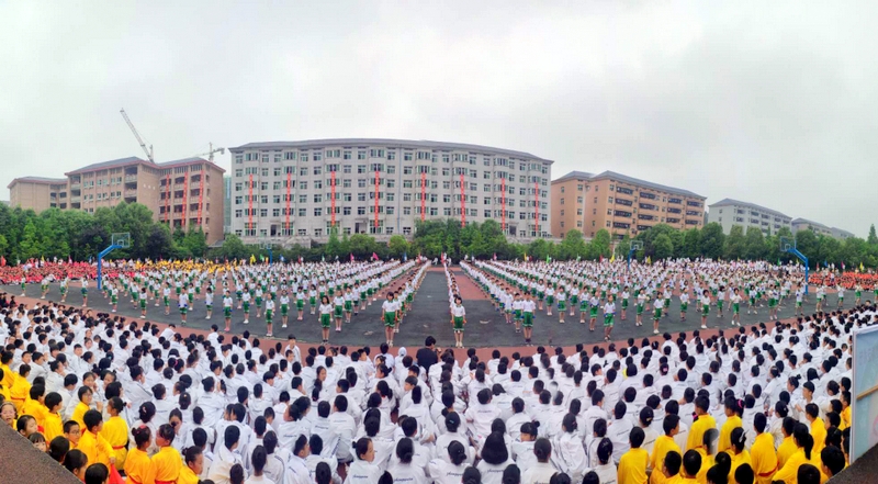 五年级918名同学,身着黄色武术服,腰扎红丝带,手执太极功夫扇,为我们带来了精武武术操《中国功夫》。