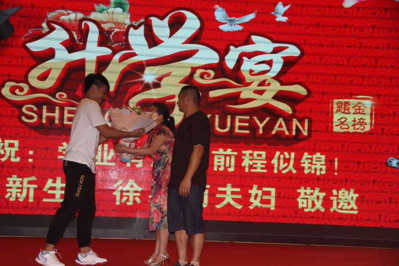 升学宴上,邓定杰向爸爸妈妈献花,并深深鞠躬,感谢父母的养育之恩。