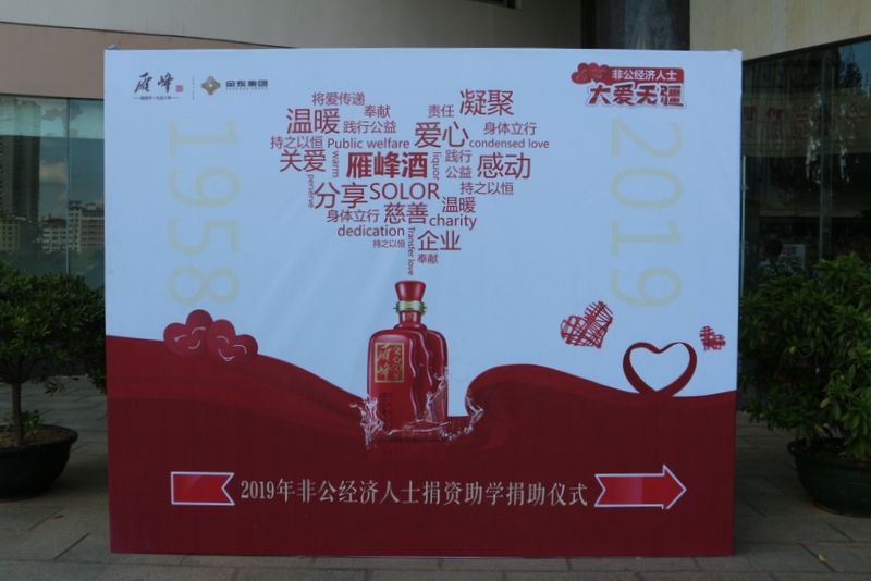 雁峰酒业公司领导等非公经济人士代表发言,表达回馈社会、促进社会和谐的心愿。学生代表发言,表达要好好学习、感恩社会、报效祖国的决心。