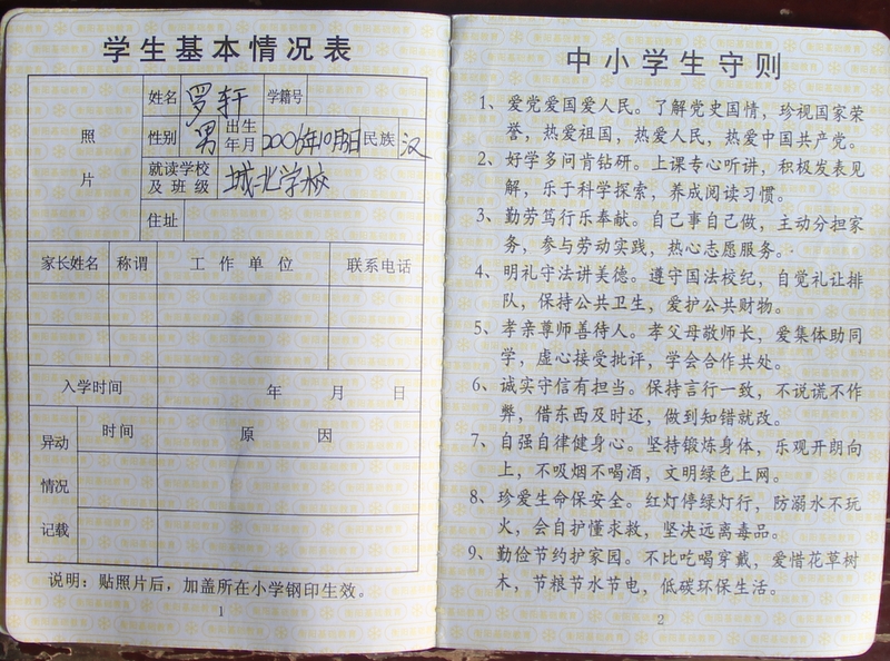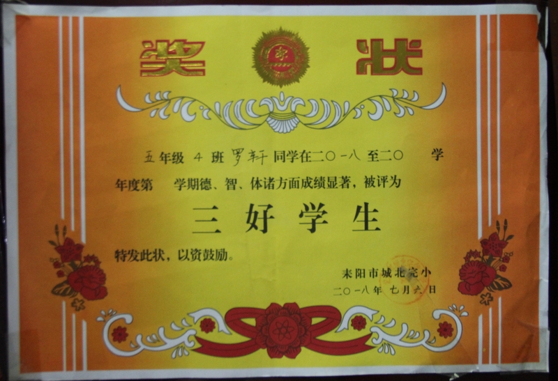 罗轩,老家位于长坪乡西岭村五组,出生不久父亲意外亡故,母亲是外地人,随之离家出走,至今未归,爷爷奶奶带着他在耒阳城区谋生。现在全家借住在金南亲戚家,罗轩在城北小学读书。爷爷罗育光今年65岁,前些年一直在工地做塔吊指挥员,现在年纪大了,在家门口做点临工挣钱。奶奶八九年前患有子宫癌,治疗花了很多钱,现在仍然不得不在广东一个食堂打工,月收入仅2000元。前两年罗轩办了孤儿证,政府每月补助800元。小学阶段,罗轩获得很多次三好学生、优秀班干部表彰和各种比赛等奖状。