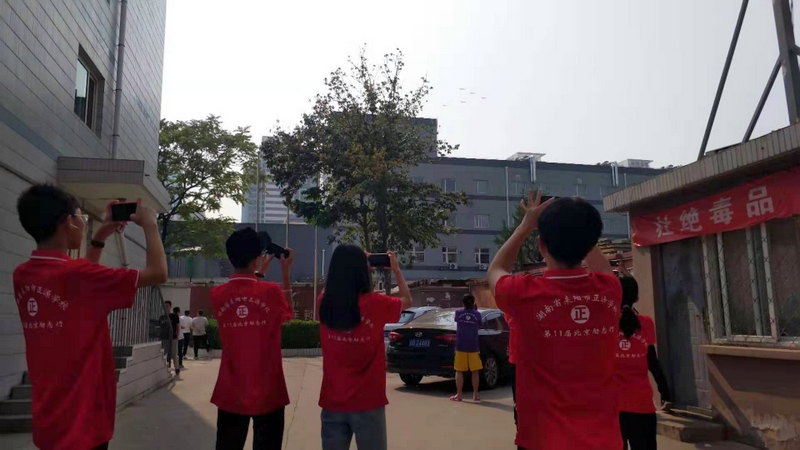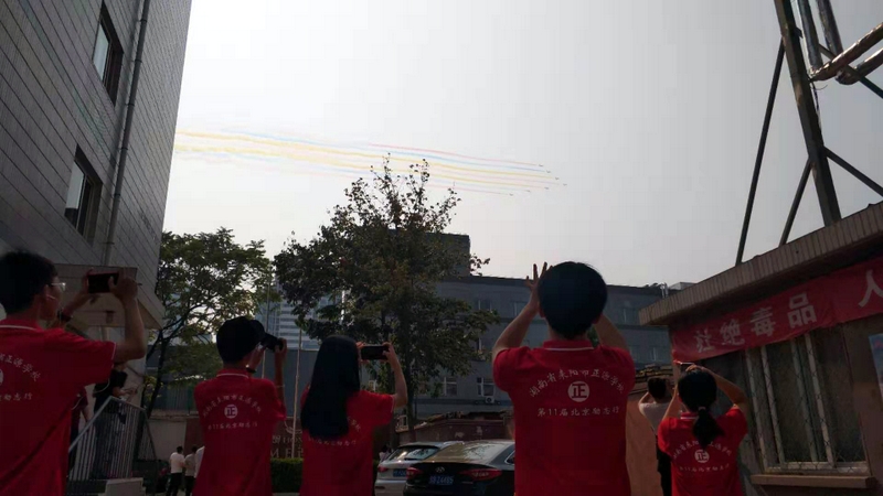 上午十点半后,习主席检阅部队结束,各兵种表演开始。看到各种高科技的武器装备,同学们惊叹不已,顿感祖国的强大威武。但更让同学们意想不到的是,突然听到头顶上传来轰轰轰的巨大声响,他们赶紧跑出房间来观看,哇!飞机!军用飞机!同学们立马明白这是接受检阅的飞机,迅速拿出手机开始对空拍照。一组又一组接着飞过来!