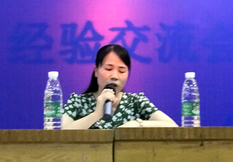交流会的上半场是教学经验分享。第一位分享的是曹永霞老师。曹老师从教17年,有着丰富的教学经验。在教学方面,有自己的独特技巧,所教班级成绩几乎在年级的每一次测评中都遥遥领先。曹老师畅谈了自己英语语法教学的四种途径:1. 英语歌曲教学法,通过使用适当的英文歌曲及其歌词达到教学目的;2.直观手段教学法,使用实物和多媒体相结合的方式来传授语法知识;3.口诀教学法,朗朗上口的口诀让学生把语法知识牢记在心;4.游戏教学法,学生在竞争的氛围中学习,专注度集中,寓教于乐,课堂效果好。