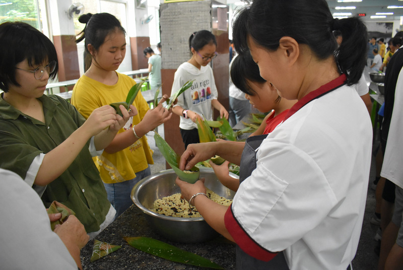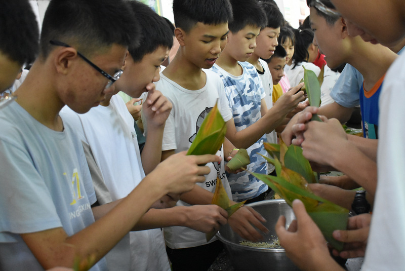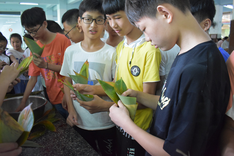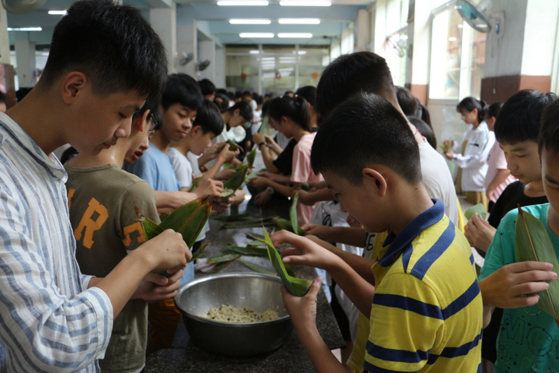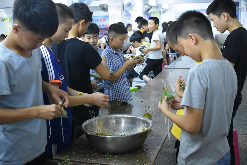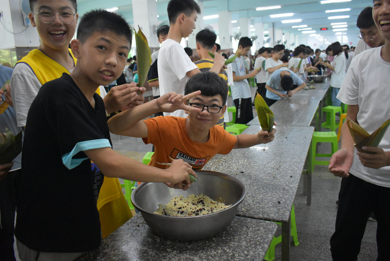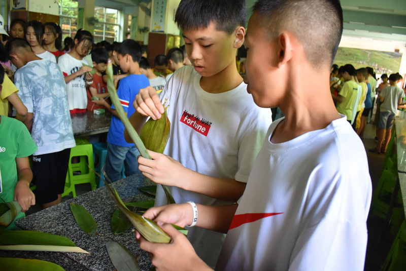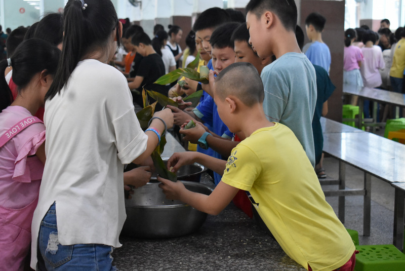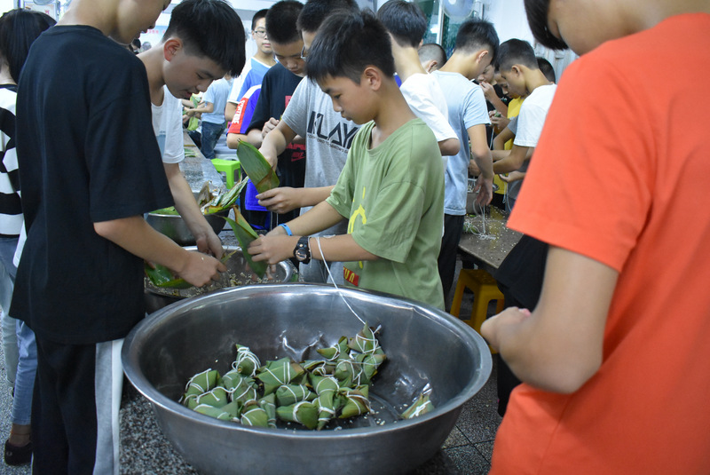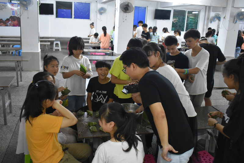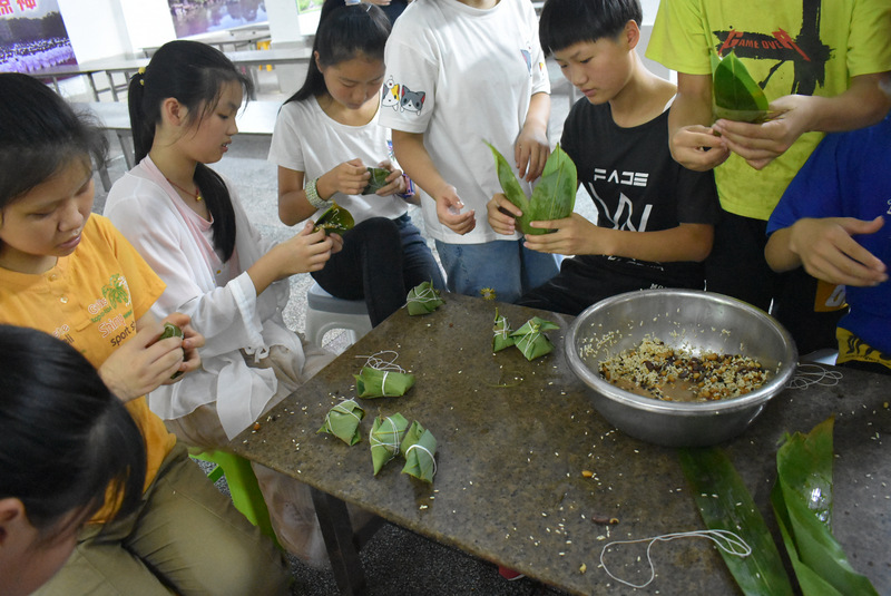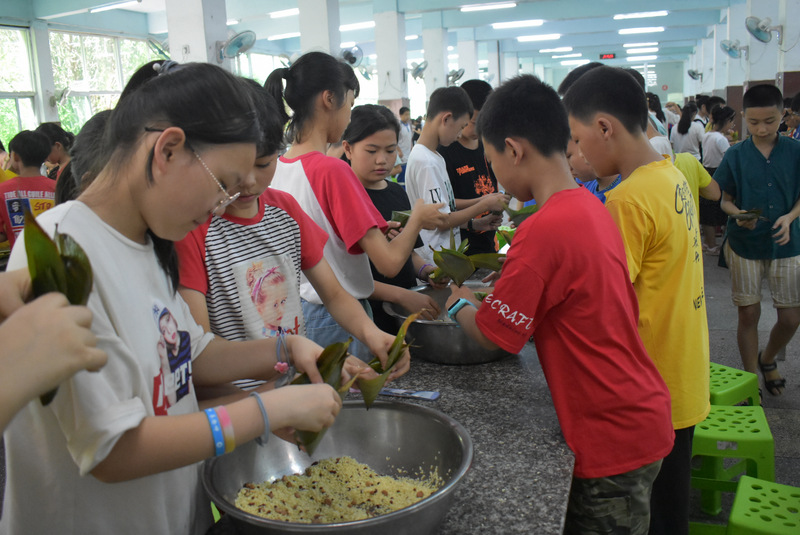 开课第一天,准初一、初一年级的孩子们在就餐食堂,沿餐桌而立,桌子上摆好了包粽子所需食材,粽叶、糯米、红枣、葡萄干、红豆等。在食堂阿姨的指导下,同学们迅速进入状态,选两三片粽叶,折叠成漏斗形状,在漏斗中放糯米、红枣等食材,折叠粽叶包住糯米,用细线缠绕几圈,一个漂亮的粽子就这么包好了。