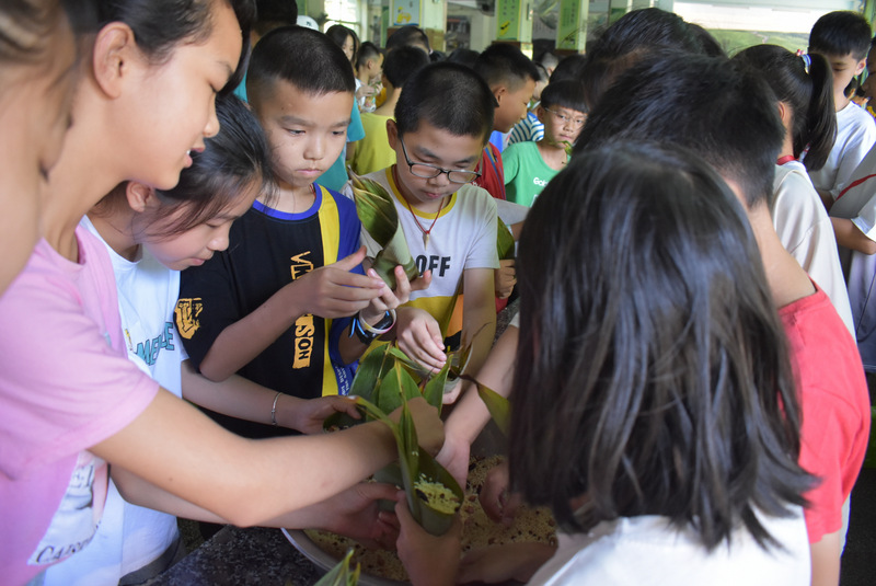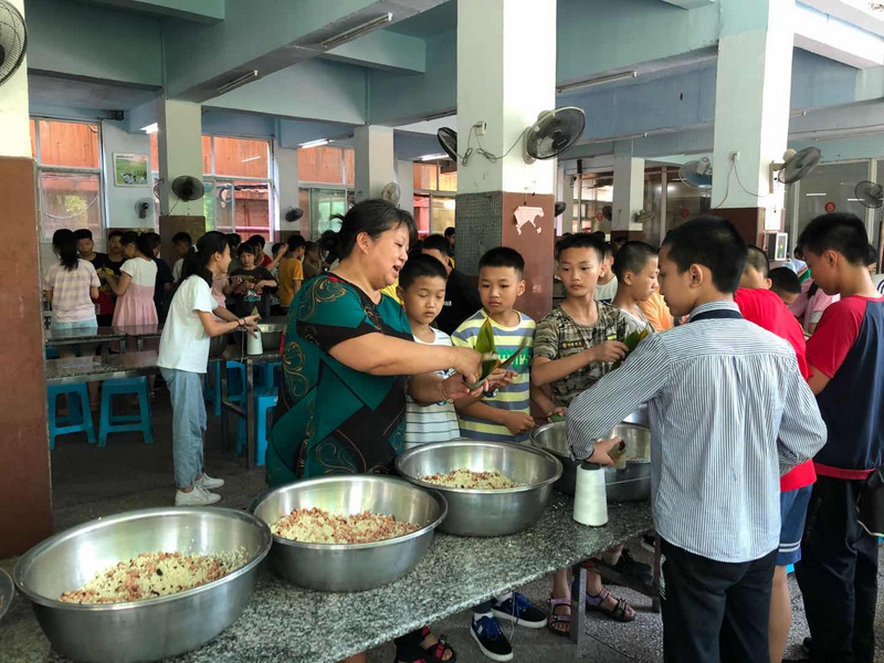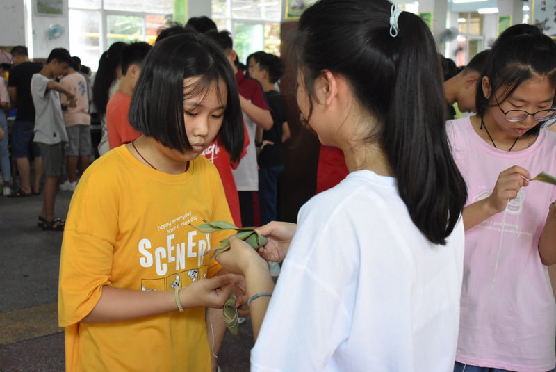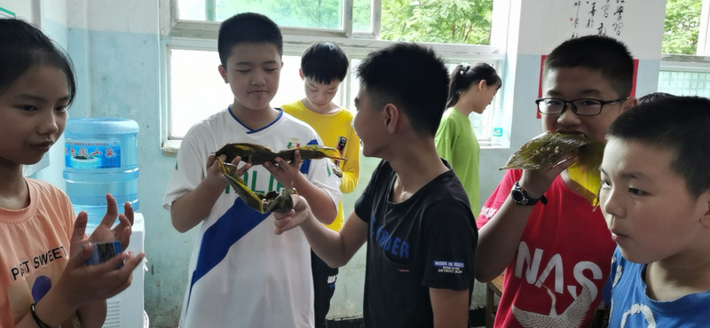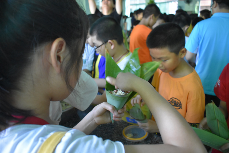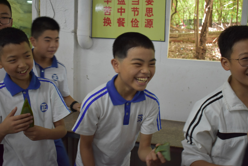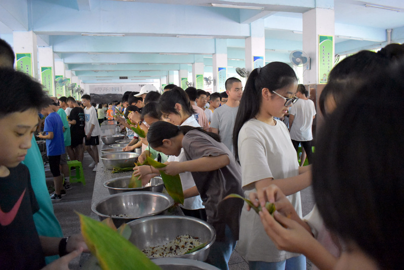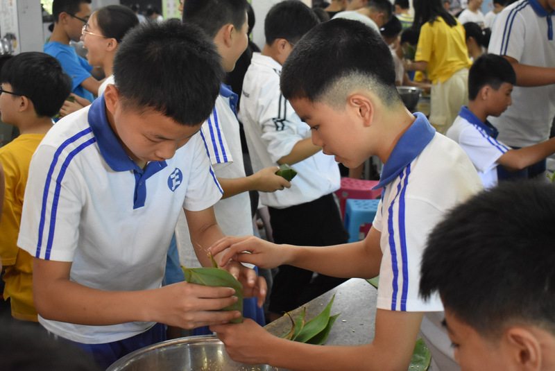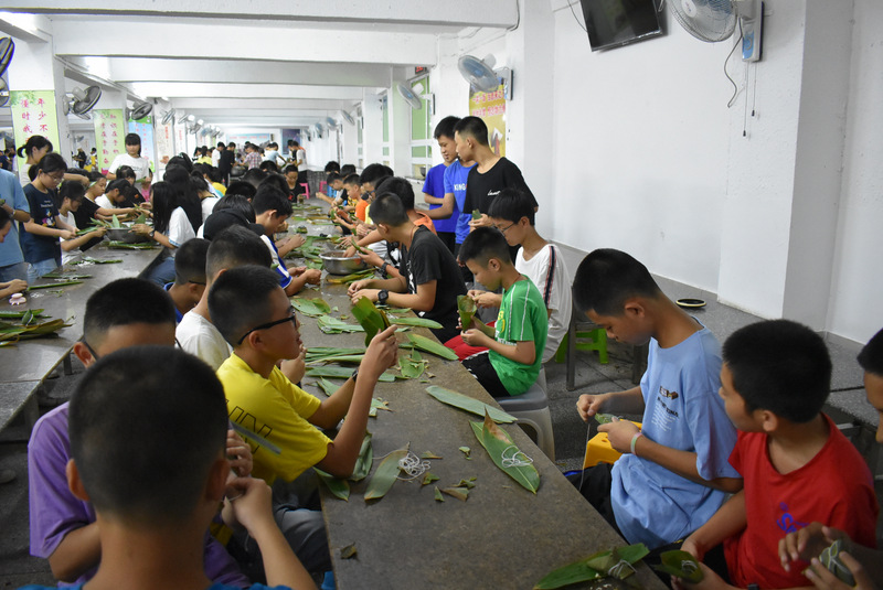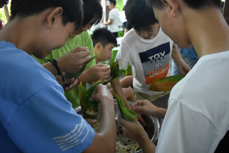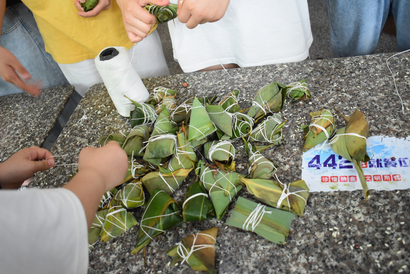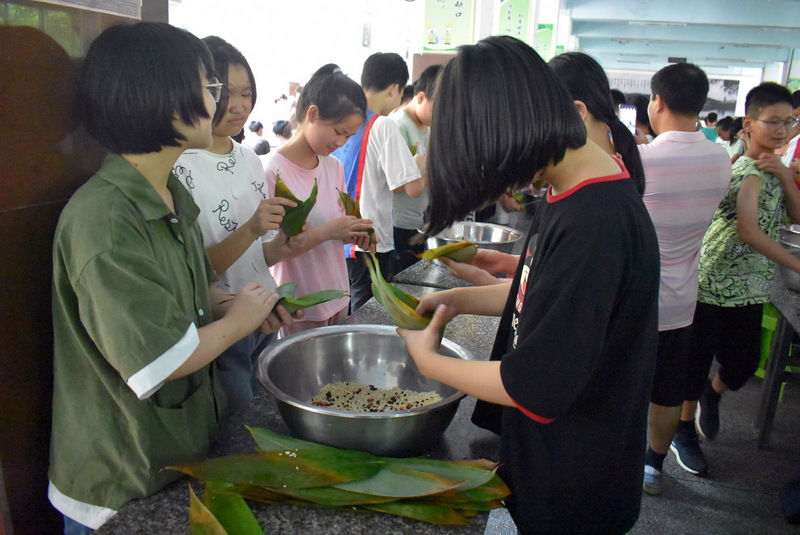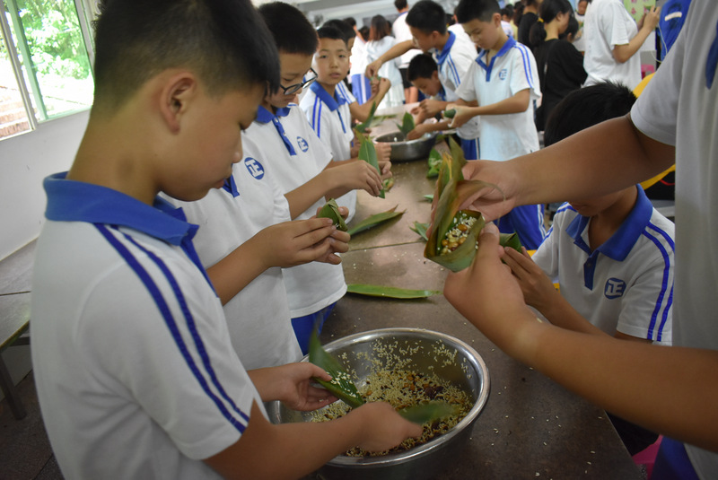 开课第一天,准初一、初一年级的孩子们在就餐食堂,沿餐桌而立,桌子上摆好了包粽子所需食材,粽叶、糯米、红枣、葡萄干、红豆等。在食堂阿姨的指导下,同学们迅速进入状态,选两三片粽叶,折叠成漏斗形状,在漏斗中放糯米、红枣等食材,折叠粽叶包住糯米,用细线缠绕几圈,一个漂亮的粽子就这么包好了。