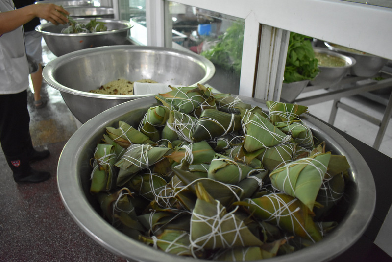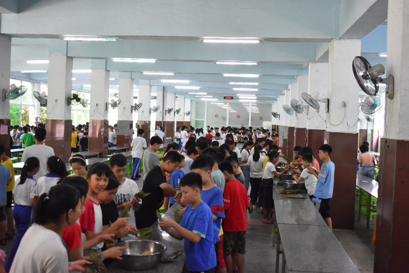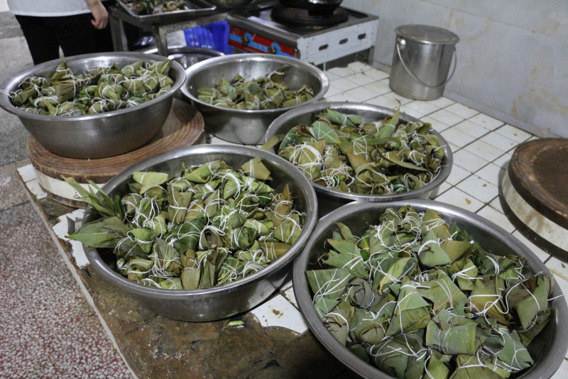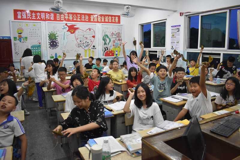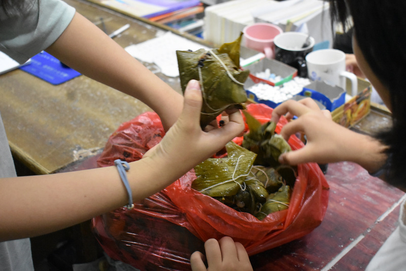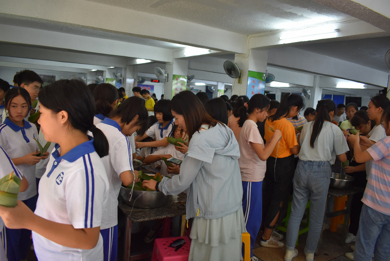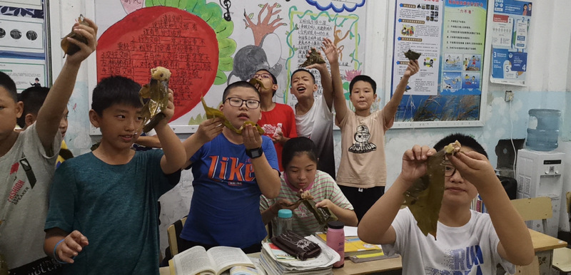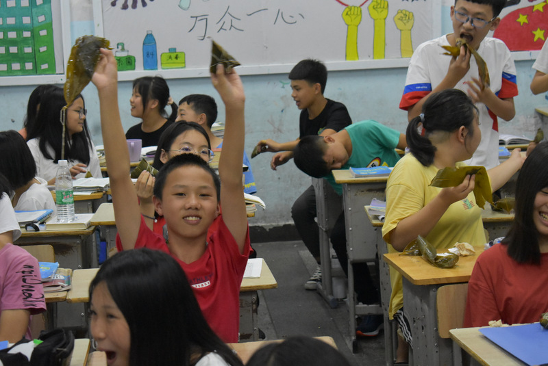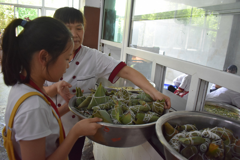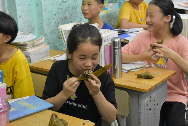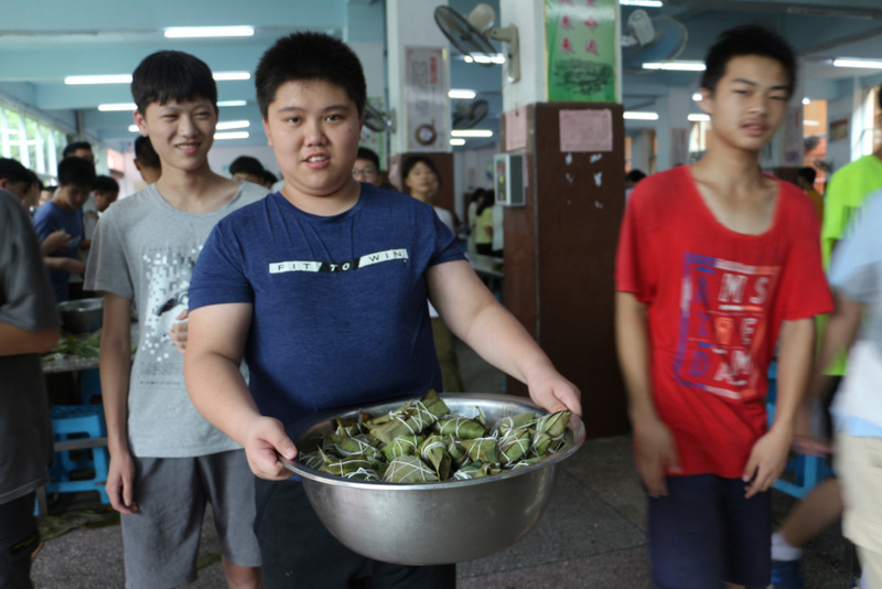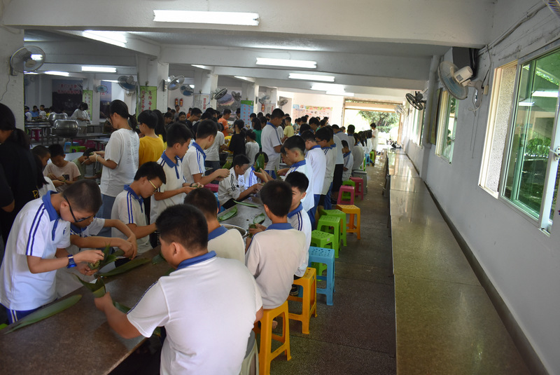 开课第一天,准初一、初一年级的孩子们在就餐食堂,沿餐桌而立,桌子上摆好了包粽子所需食材,粽叶、糯米、红枣、葡萄干、红豆等。在食堂阿姨的指导下,同学们迅速进入状态,选两三片粽叶,折叠成漏斗形状,在漏斗中放糯米、红枣等食材,折叠粽叶包住糯米,用细线缠绕几圈,一个漂亮的粽子就这么包好了。