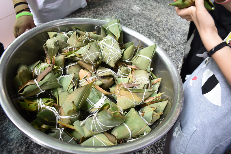 记者在现场发现,三天下来,各个年级包好的粽子形状多样,让人大开眼界。有标准尖角棕、有粗壮的四角粽,有害怕粽子煮跑了的五花大绑粽、有长条粽等等,花样百出,各具特色。
