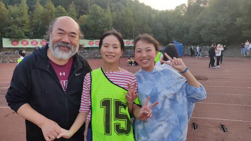 准高一年级女子3000米跑即将开始,起跑处一阵骚动,罗校长亲自给3000米长跑的女生助威来了!
