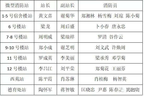 14、1、2号楼栋长黄文喜,3、4、5号楼栋长谢菊华,6号楼栋长梁龙,7、8号楼栋长周明威,9、10号楼栋长郑小成,西苑栋长陈平霞,11号楼栋长罗成英,12楼栋长李吕江:各楼栋长为本楼栋安全直接责任人,安排生活老师就寝时段轮流巡逻寝室,配合相关年级领导对学生违规物品进行清理,对违规行为进行查处。作为微型消防站负责人,安排学生就寝时段半专业消防队员值班。对本楼栋所有消防器材和设施进行检查、维护、和对相关人员培训使用,并登记培训情况,作为培训补贴的依据。利用《正源宿舍工作日志》对学校各部门来楼栋检查工作的同志进行登记,作为安全奖罚依据。