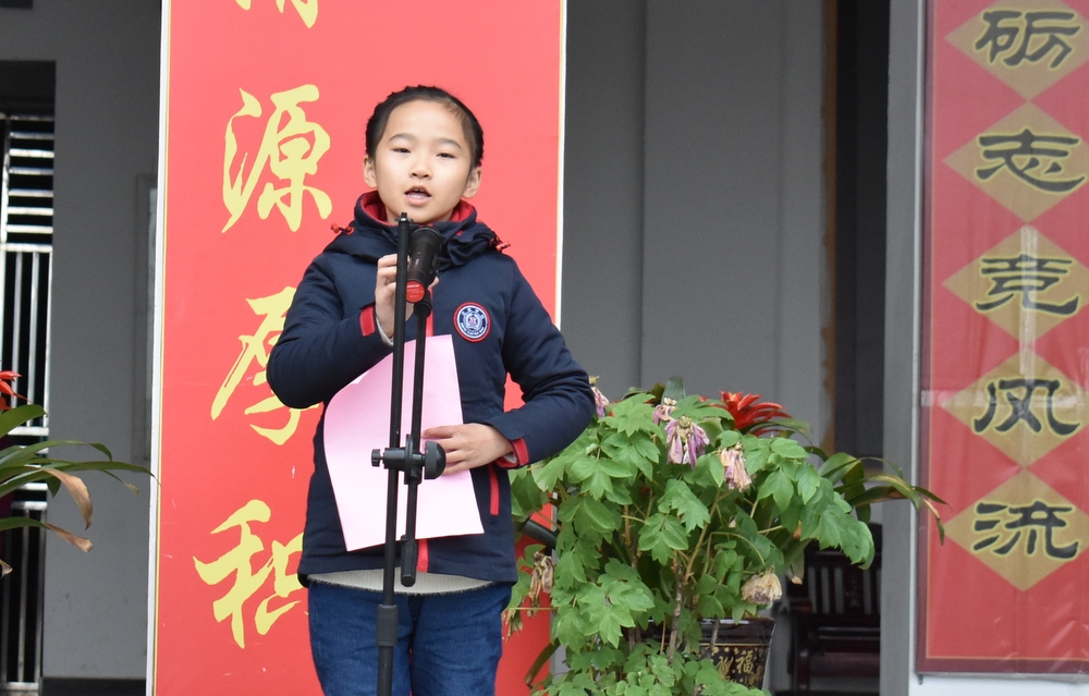 四年级330班黄萌同学抬头挺胸踏上主席台,代表小学部同学,用遍布校园的青青杨柳、灼灼桃花、翩翩燕子等春日美景,描绘诗情画意的校园生活,表达小同学们快乐学习、茁壮成长的美好愿望。