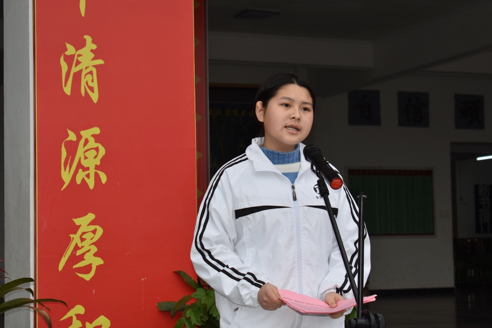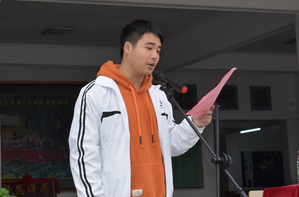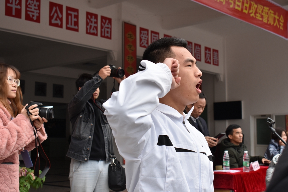 高三年级主任曾晓辉、高三教师代表刘引、高三学生代表张国政发言之后,进入了激动人心的宣誓环节。高三教师庄重宣誓“甘做人梯,做学生坚强的后盾;培育栋梁,为高考保驾护航。奋战一百天,我们定倾尽全力;拼搏至六月,今年高考定辉煌!”