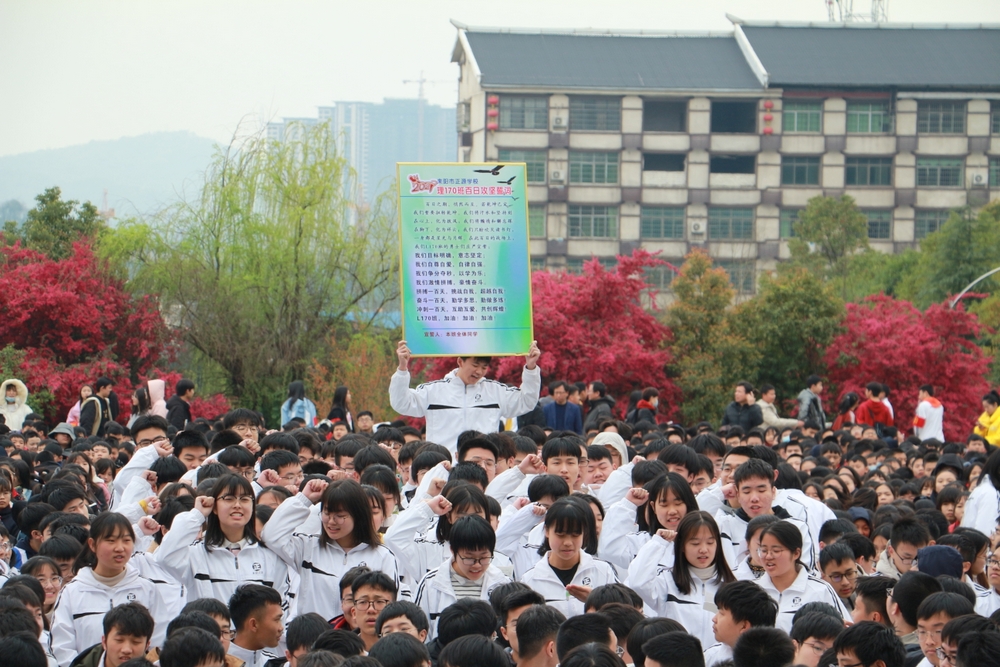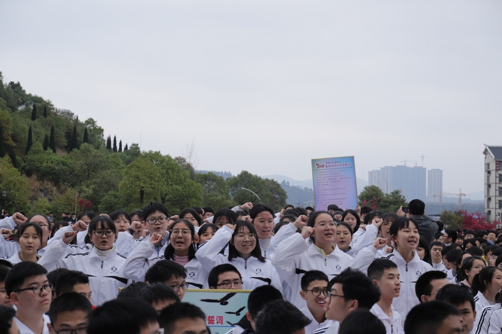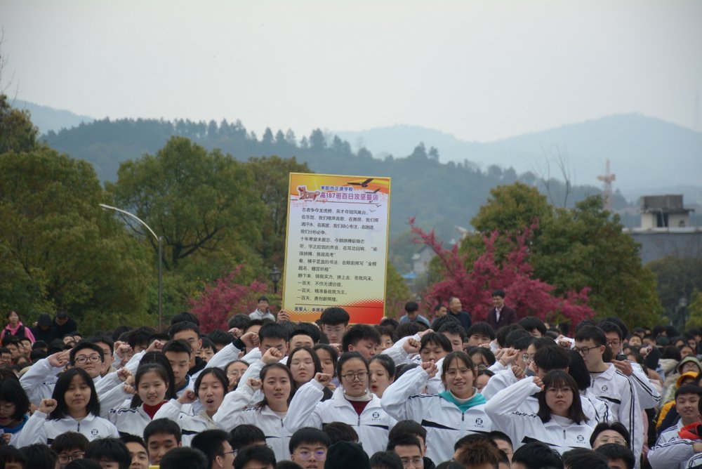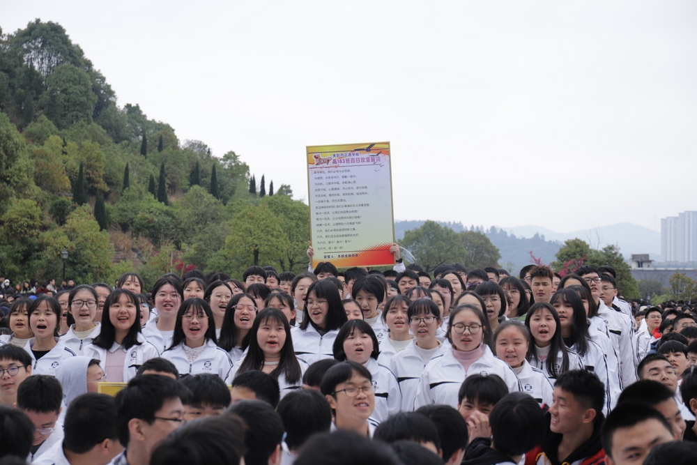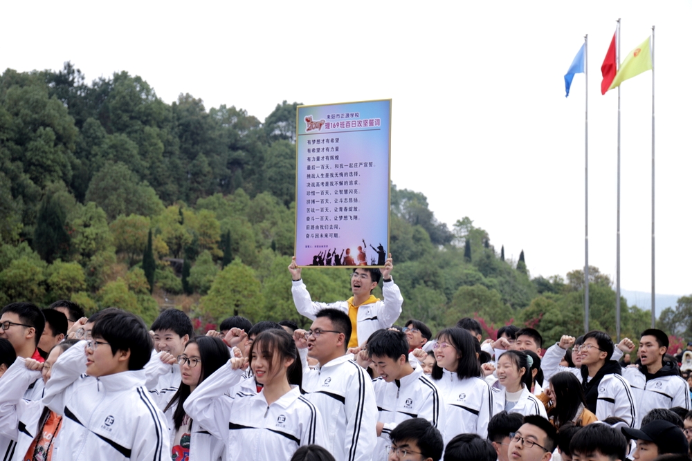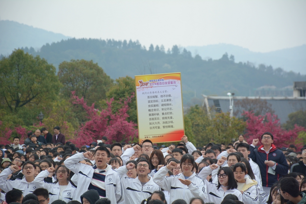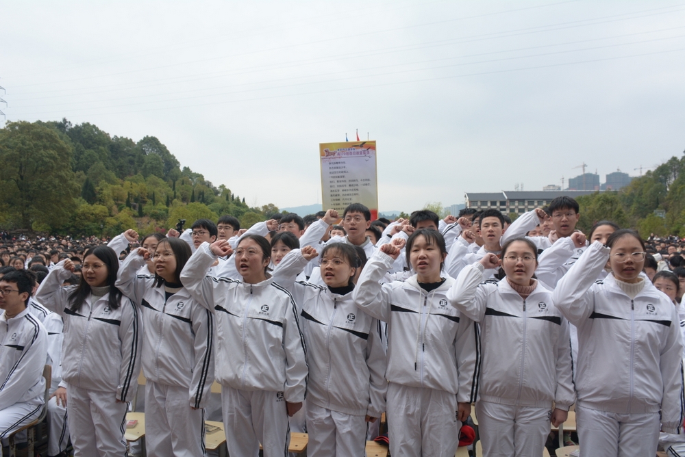 高三年级二十六个班1882名学生依次起立,握掌为拳,次第振臂高呼班级誓言。“分分秒秒, 绝不辜负!乘风破浪, 展我鸿鹄!”,“奋斗一百天, 燃烧岁月, 燃不尽心中理想!奋斗一百天 ,磨砺剑刃 ,磨不去豪情万丈!”,“高三无悔, 高考无憾!与时间赛跑 ,与日月争辉!”,“且看我辈定乾坤, 少年自有少年狂!”……此起彼伏的誓言叩击心扉,豪情万丈的呐喊直冲云霄!