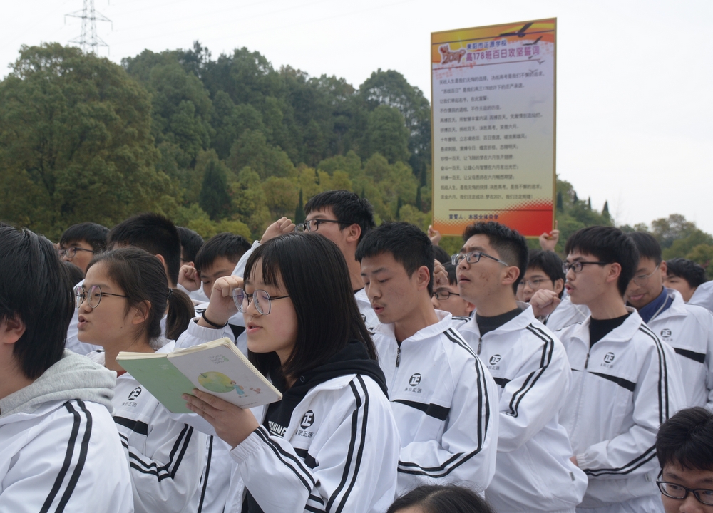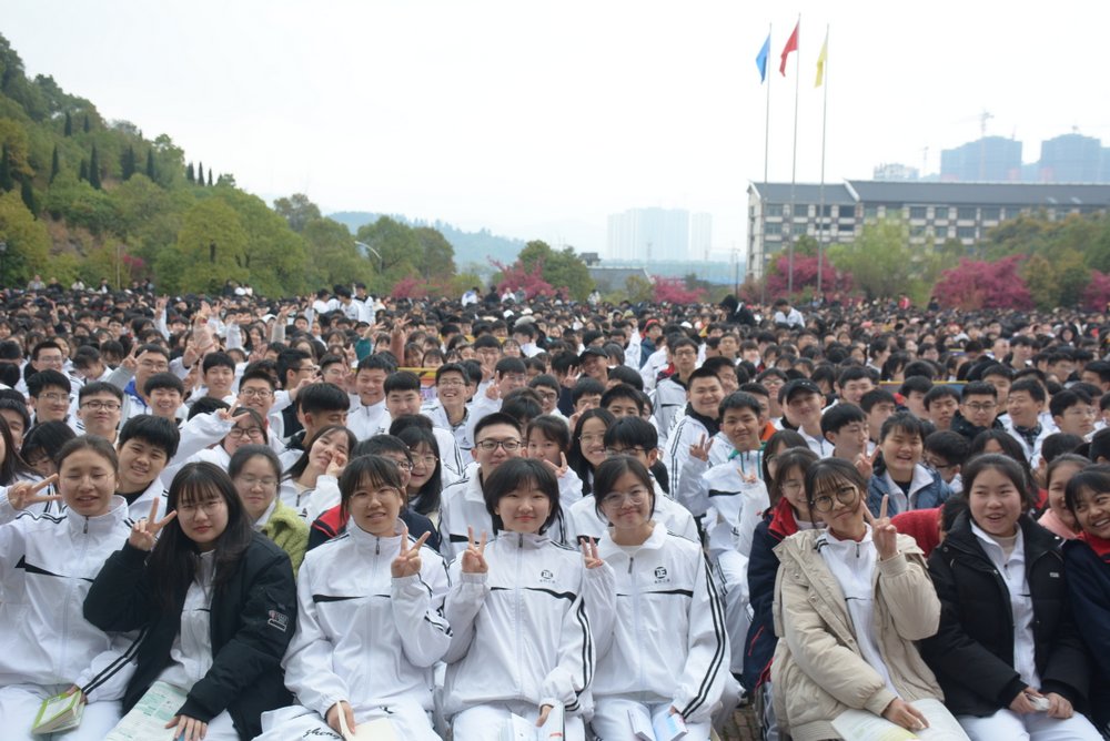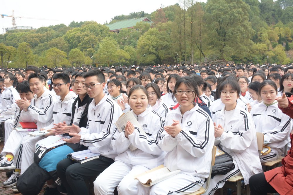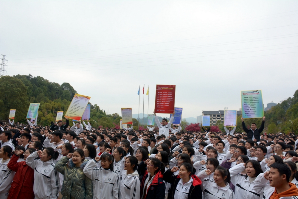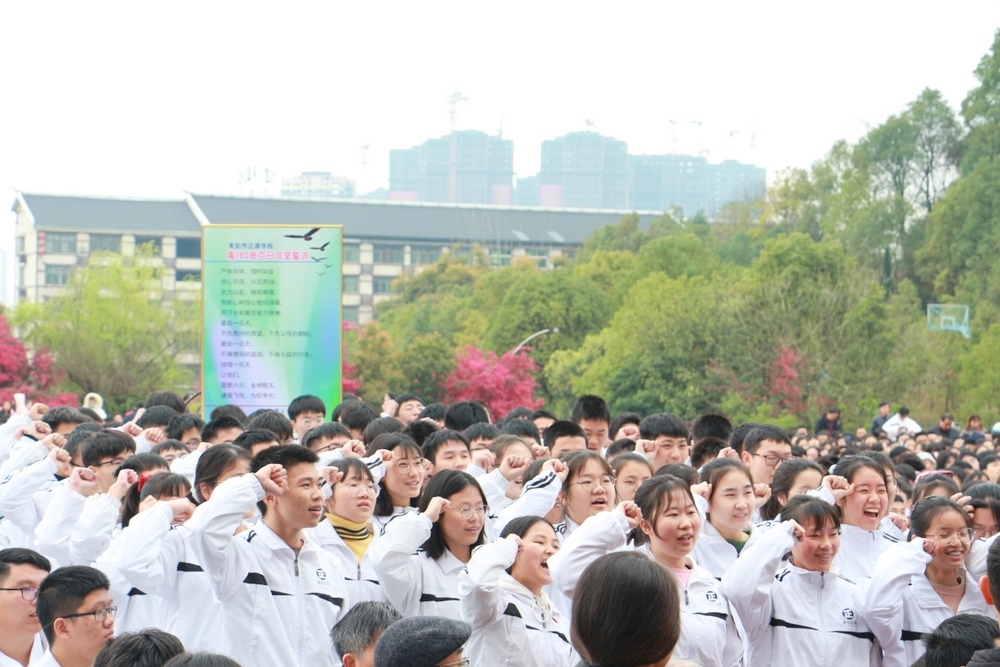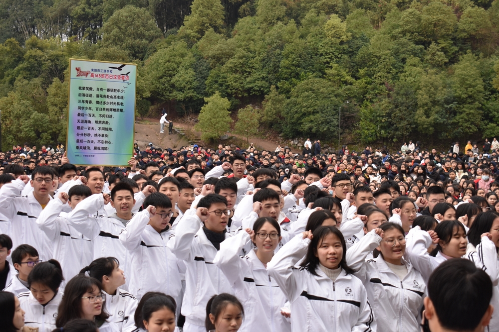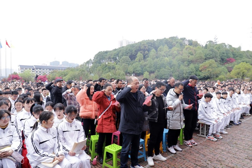 高三年级二十六个班1882名学生依次起立,握掌为拳,次第振臂高呼班级誓言。“分分秒秒, 绝不辜负!乘风破浪, 展我鸿鹄!”,“奋斗一百天, 燃烧岁月, 燃不尽心中理想!奋斗一百天 ,磨砺剑刃 ,磨不去豪情万丈!”,“高三无悔, 高考无憾!与时间赛跑 ,与日月争辉!”,“且看我辈定乾坤, 少年自有少年狂!”……此起彼伏的誓言叩击心扉,豪情万丈的呐喊直冲云霄!