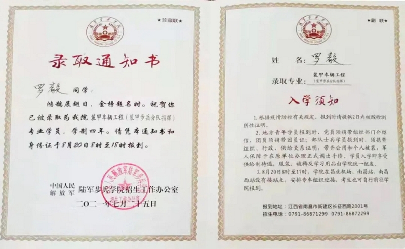 交谈中,记者留意到,父亲罗军说得最多的是“参军”两个字。或许,在父亲的执念中,罗毅能够参军入伍,弥补自己的遗憾,他就心满意足了。在得知儿子被誉为“将军的摇篮”的陆军步兵学院录取的时候,罗军喜出望外,几十年的梦想“超额完成”,高兴的泪水唰的一下就从这个坚毅的汉子脸庞滚落,“我一家三代的从军梦,儿子帮我续上了。”妻子刘若梅也激动得一整夜都没睡着,“太激动了!听说这个军校出了几十个将军。”